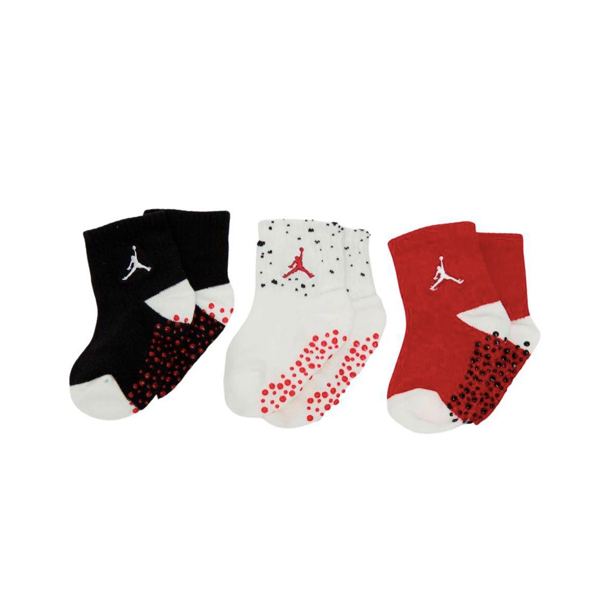 Pack de 3 chaussettes pour bébé. Tissu extensible avec mélange de polycoton. Semelles antidérapantes pour éviter de glisser sur n'importe quelle surface. Logo Nike Jordan Jumpman brodé.