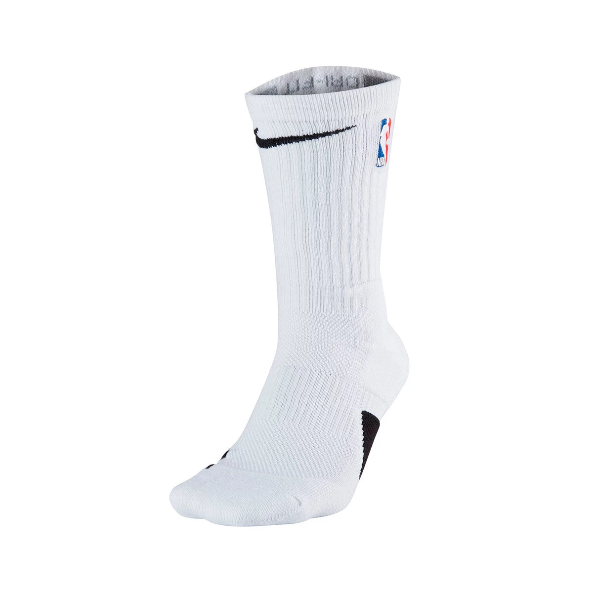 Les chaussettes de basket-ball Nike NBA Elite offrent un ajustement ferme avec une bande de pont et un amorti stratégique pour absorber les chocs lorsque vous courez sur le terrain.