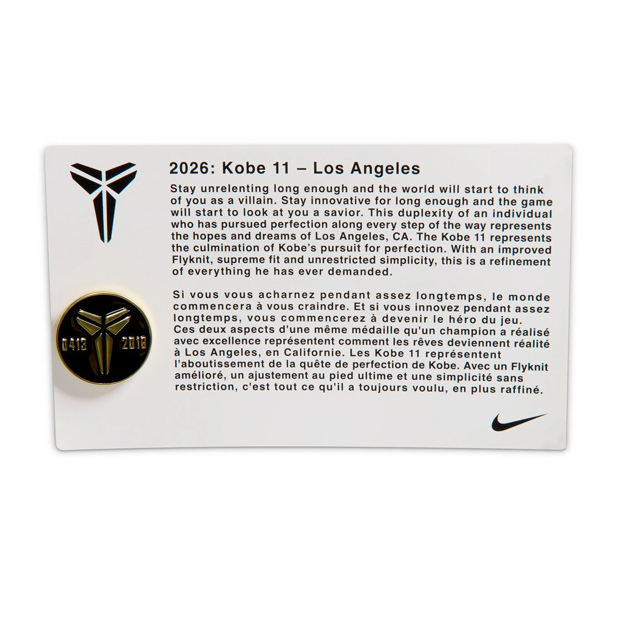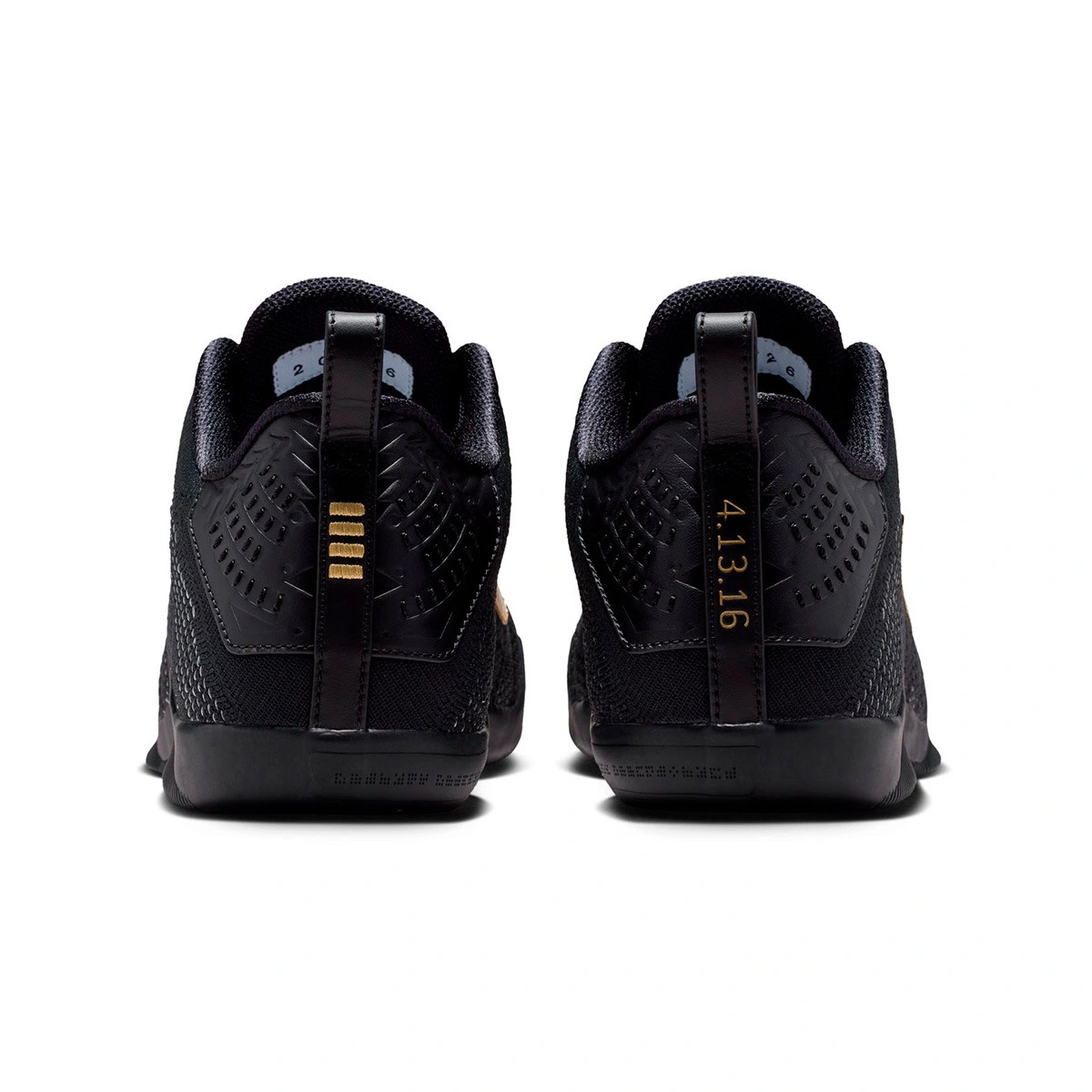 L’empeigne entièrement noire reflète la sobriété et l’élégance de la dernière étape de Kobe, tandis que les détails dorés rompent l’obscurité pour rappeler tout ce qu’il a laissé derrière lui : titres, records, sacrifices et vingt ans à marquer une époque. Sur le talon apparaît la date du 13.04.16, le jour de son dernier match, et d’autres petits clins d’œil rappellent sa récupération du tendon d’Achille et ses vingt saisons en NBA.