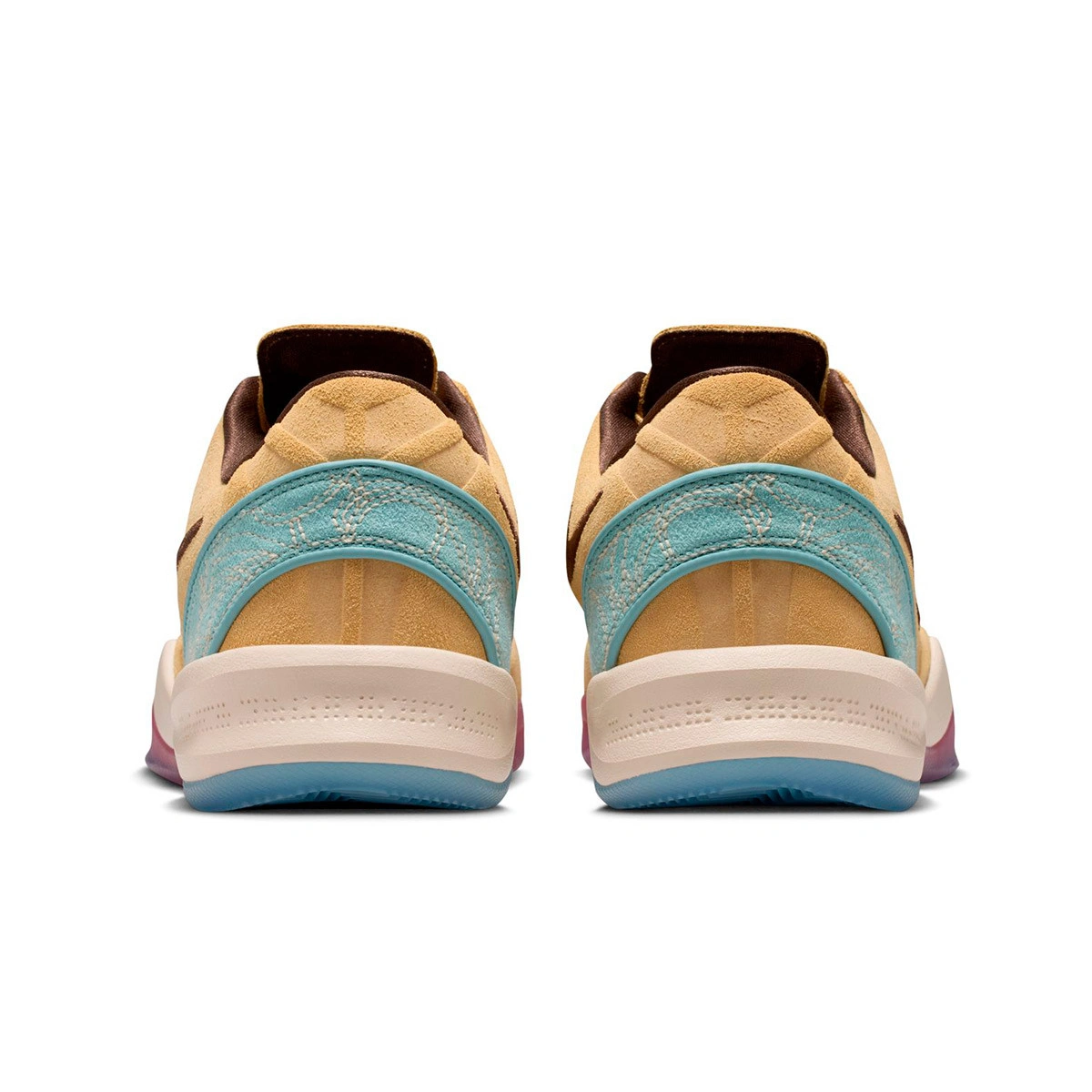 Toute la chaussure tourne autour de cet univers équestre partagé par Kobe et Pau : la partie supérieure couleur sable rappelle la robe du cheval, les détails en marron foncé utilisent une finition type pony hair et les coutures du talon semblent sorties d’une selle. Même la semelle translucide mélange bleu et rose, comme si le cheval disparaissait à l’horizon au coucher du soleil.